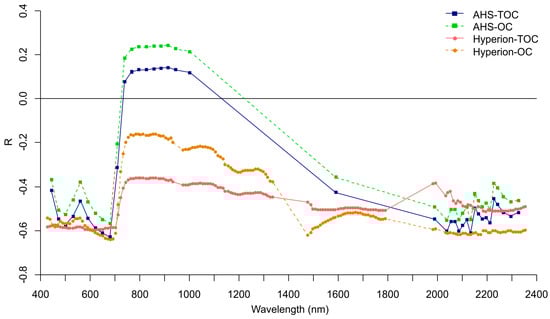 The correlation coefficient R was calculated at each wavelength between soil properties, TOC and OC, and reflectances from the AHS and Hyperion images (Figure 3). A relatively high negative correlation was observed in several wavelengths of the spectrum, with R between −0.5 and −0.65, approximately. Darker soils, with lower reflectance, usually have higher organic matter content [80,81], which explains the negative correlation observed in Figure 3.
