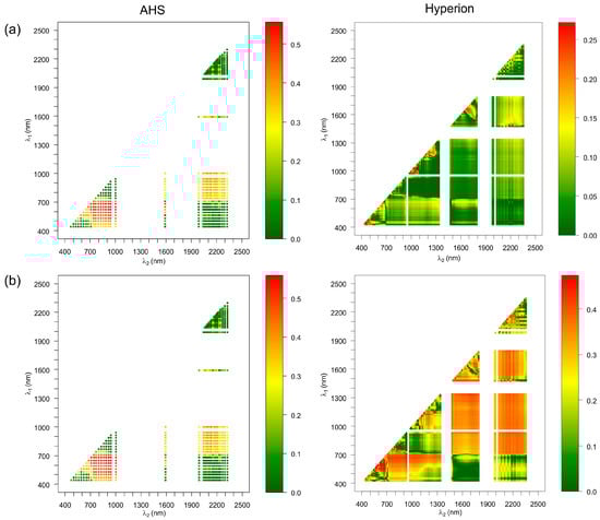 Coefficient of determination R2 between the TOC (a)/OC content (b) and the spectral indices SIλ2−λ1 = (ρλ2 − ρλ1)/(ρλ2 + ρλ1), based on AHS (left) and Hyperion (right) reflectance values. R2 values in the graphs are symmetric with respect to the 1:1 line, and therefore λ1 and λ2 can be used interchangeably.
