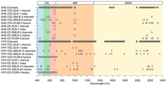 Important wavelengths in the regression models for TOC/OC estimation using AHS and Hyperion data. The width of each channel corresponds to the full width at half maximum (FWHM). AHS and Hyperion channels used in this study are represented in dark grey. HYP = Hyperion, VIS = visible; NIR = near infrared; SWIR = short-wave infrared.