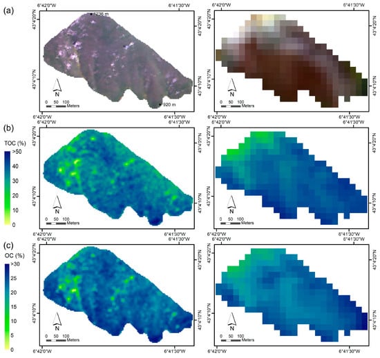 True-color composite (a) and maps of topsoil TOC (b) and OC content (c) predicted using the SMLR models based on spectral indices at the Combo site. Left: AHS image (airborne, spatial resolution of 5 m). Right: Hyperion image (satellite, spatial resolution of 30 m). The location of the Combo site is shown in Figure 1.