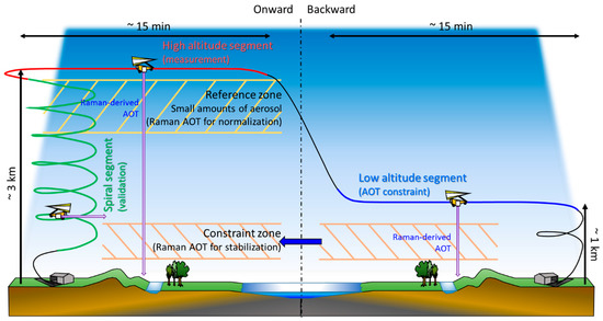 First, the flight plan comprises a slow spiral ascent (or descent) up to approximately 3 km above the mean sea level (amsl) (or from 3 km amsl to the ground). This altitude limitation is due to restrictions imposed by air traffic control over the campaign area. More generally, research aircrafts also often encounter such constraints due to local regulations or the presence of other onboard instruments. During this spiral phase, the Lidar is aiming horizontally. Once at the ceiling altitude, the Lidar is rotated to aim at the nadir. The ULA then flies successively at two altitude levels (high altitude/ceiling, and low altitude/PBL top) but above the same ground track, so as to measure roughly the same atmospheric volume. The low altitude stage, just above the PBL, uses Raman-derived AOT to constrain the inversion of the profiles acquired in the high-altitude stage. This measurement scenario assumes that the atmospheric content does not vary much between the two stages, which can be verified a posteriori by the evolution of measured optical properties during each stage. The variation will also be included in the error budget developed in Section 4.