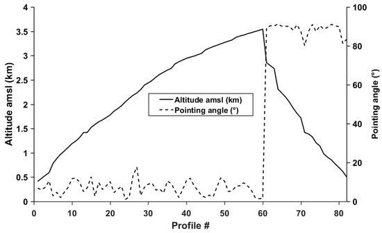 Flight profile altitude and the pointing angle for the flight A (18 June 2015), where the first 590 profiles are pointing down as the ULA rises, and the last 24 are pointing horizontal as the ULA descends. The nadir and horizontal phases are ~20 and ~7.5 min, respectively.