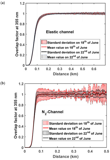 The overlap factor is assessed using an approach already described in Chazette [36]. The overlap factors of both the elastic and N2-Raman channels are given in Figure 4. They include the horizontal measurements of flights A and B. For the elastic channels (Figure 4a), the two flights give similar results with an overlap factor equal to 1 at a ~0.2 km distance from the emitter. This distance is reduced to ~0.1 km for the N2-Raman channel (Figure 4b). Flight A on 18th of June, performed during daytime, shows a higher level of noise than flight B, as could be expected.