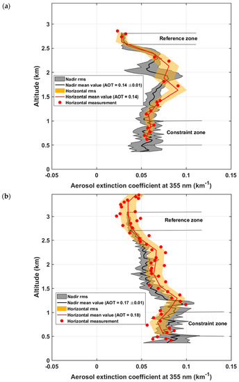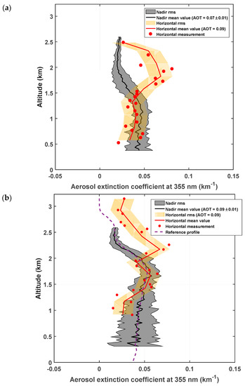 Horizontal measurements are inverted, as proposed by Chazette et al. [37], between ~0.3 and 0.8 km from the ULA. For flights A and B, vertical profiles of AEC obtained during the descent of the ULA are shown in Figure 5, as red lines, surrounded by an orange area representing uncertainty projected from the noise level. The final vertical resolution is only 250 m, so as to accumulate enough measurement points (red dots). This method using the elastic channel is mostly immune to sky background noise in the considered ~1 km range, as shown by the moderate dispersion of the results, which result from both noise-induced uncertainty and the natural variability of the atmosphere along the line of sight and within 250 m of strata. Note that the profiles retrieved using the N2-Raman channel in the same horizontal setting during the nighttime show similar trends of AEC as in Figure 5, but with ~3 times higher root mean square (rms) error. During the daytime, measurements are impossible with this channel due to insufficient signal to noise ratio (SNR).