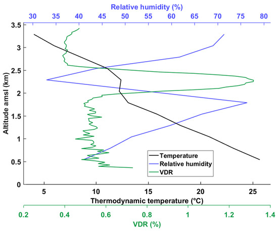 A large discrepancy exists between the retrieved values of AEC from horizontal and the nadir shots on flight A (18th of June, Figure 5a), as observed above 1.5 km amsl, and AEC from horizontal measurements are higher by about 35%. We attribute this to the strong variability of aerosol scattering properties around this altitude on this day. Indeed, between 1.5 and 3 km amsl, a dry layer possibly containing terrigenous particles can be identified, as shown in Figure 6. This layer is associated with relative humidity values below 40% between 2 and 2.5 km amsl. Volume depolarization ratio (VDR) is measured there to be 1.2%, corresponding to particle depolarization ratio (PDR) values between 4% and 5% (Chazette et al. [42] for the calculation method). At the base of this layer, the atmospheric instability has led to the formation of cumulus-type clouds, maybe facilitated by the presence of aerosols as condensation nuclei. During the daytime throughout the campaign, cumulus clouds have been observed above the Aubenas airfield, creating inhomogeneity along the flight, leading to a possible overestimation for horizontal measurements of the AEC in the lower free troposphere.