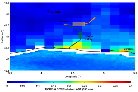 Ground-tracks of flights C (orange) and D (green) on 24 June 2015. The ground-tracks are superimposed to the aerosol optical thickness (AOT) at 550 nm derived by MODIS (over continent) and SEVIRI (over sea). The AOTs are computed between 10:00 a.m. and 2:00 p.m. UTC (universal time count). The framed areas represent the parts of the flight paths where the study is carried out.