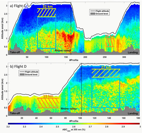 Vertical profiles of the normalized apparent backscatter coefficient (ABCapp) corrected for the molecular transmission for: (a) flight C and (b) flight D on 24 June 2015. Profile number (i.e., time) is indicated in abscise. The profiles used for the study are hatched in orange for the constraint zone between 0.5 and 1 km amsl and yellow for the reference zone between 2.35 and 2.85 km amsl. The inverted profiles are framed in blue. The horizontal distances over which these signals are averaged are indicated.