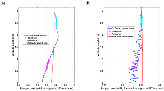 Example of random draws used for the Monte Carlo approach for: (a) the elastic channel and (b) the N2-Raman channel. The reference altitude interval (2.35–2.85 km amsl) is given by turquoise circles and the constraint altitude interval (0.5–1 km amsl) is given by purple circles. A purely molecular Lidar signal is drawn as a continuous red line.