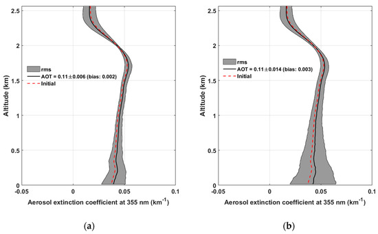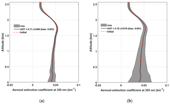 Vertical profiles of the aerosol extinction coefficient (AEC) retrieved using the Monte Carlo approach for flight strategies: (a) on two flight altitude levels and (b) on a single flight altitude level. The initial value is given by the red dotted line, the mean AEC retrieval is given by the black continuous line. The standard deviation (rms) is highlighted in gray.