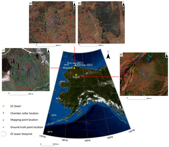 Therefore, we mapped the vegetation communities within the EC tower footprints at four sites across the North Slope of Alaska using high-resolution WorldView-2 imagery and assessed if different mapping methods affected the upscaling of chamber-based CH4 fluxes. We also tested how the up-scaled chamber-based fluxes using non-weighted and footprint-weighted areal estimates compared with the ecosystem scale fluxes of eddy covariance towers. This study builds upon results from our previous work where we assessed the controls on CH4 fluxes at the plot scale of chamber-based fluxes [9] and we tested field-based tundra plant community mapping with different remote sensing data products [40].