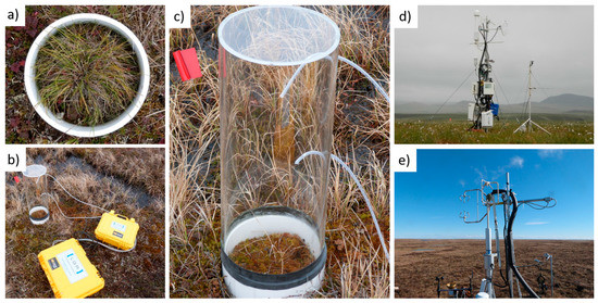 Images showing (a–c) the spatial chamber collar setup used within this study; (d) an example of the eddy covariance (EC) towers at Ivotuk (open-path LI-77 CH4 analyser); and (e) Atqasuk (closed-path DLT-100 fast response CH4 analyser).