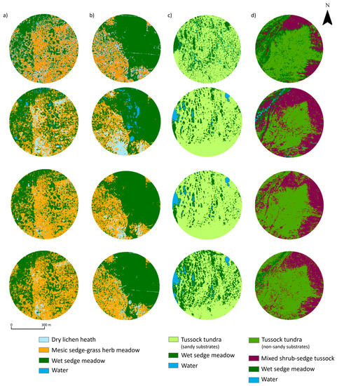 Vegetation maps created using four different mapping techniques for (a) Barrow-BEO; (b) Barrow-BES; (c) Atqasuk; and (d) Ivotuk; first row: random forest; second row: k-means unsupervised classification; third row: linear discriminant analysis (LDA); and fourth row: LDA including NDVI, NDWI, and EVI.