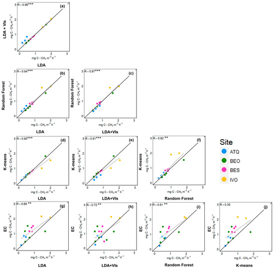 Comparisons between upscaled fluxes for the four mapping methods (a–f) and between the non-footprint-weighted upscaling and eddy covariance tower measurements (g–j) with the outliers removed. R is the correlation coefficient and ** denotes significance, p < 0.01, *** denotes significance, p < 0.001. The black line shows a 1:1 relationship and the grey line is the linear regression.
