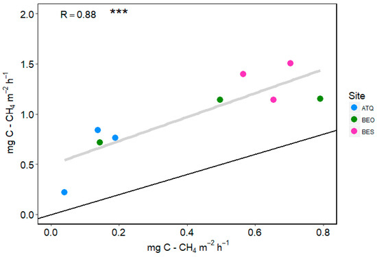 To improve upscaling estimates, understanding the phenological dynamics of the vegetation communities present could be useful, rather than just the spatial variation at one point in time [91,92]. It is interesting to see how much of an impact ‘drier’ sedge communities can have on the flux (between 10% and 38% of the measured flux) [9], further highlighting how different vegetation communities may contribute to CH4 budgets and their variability [30,91]. The use of automatic chambers could potentially bridge the gap between EC tower measurements and spatial chamber measurements as they provide detailed flux measurements with a better temporal resolution [93]. Care should be taken, however, when using chamber measurements, as they can can have lower emission values in comparison to EC towers due to the removal of the influence of wind by isolating the land surface [94].
