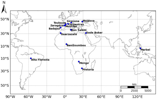 The sites presented in Table 3 and Figure 2 were selected because they are affected by a wide range of aerosol types described in CAMS, and because long-enough time series of AERONET data were available. Besides, Sentinel-2 offers a better repetitivity over Europe and Africa. The time series used in this paper range from 1 April 2016, when Sentinel-2A acquisitions started to be steadily available, to 15 October 2016.