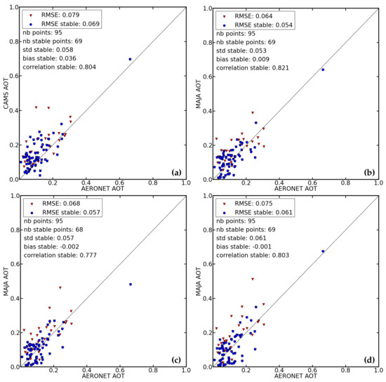 The AOT from MAJA is then compared to the mean AOT from AERONET data within 24 min around the satellite overpass time. This temporal window of 24 min is the result of an internal study, which has not been published. It was found to be a good balance between having enough AERONET data available and avoiding a too-large variation of the AOT. The following figures show the performances of the predicted AOT from CAMS (Figure 3a and Figure 4a; after temporal interpolation as described in Section 2.3.1, and taking into account MAJA cloud mask to be able to compare the same number of stable points as in the other subfigures), as well as the performances of AOT estimations by MAJA using either constant aerosol type (Figure 3b and Figure 4b), four CAMS aerosol types (Figure 3c and Figure 4c; without taking into account Black Carbon), and five CAMS aerosol types (Figure 3d and Figure 4d). Once again, to evaluate the performances, we focus on the stable cases (blue dots).