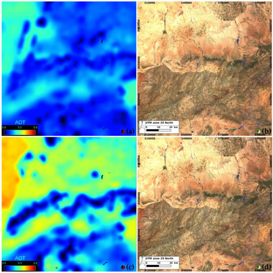 On the top left corner of the AOT figures, we can observe a higher AOT estimated when using five CAMS aerosol types (Figure 5c), leading to less hazy surface reflectances on Figure 5d compared to Figure 5b. Besides, the discontinuity on the left side of Figure 5c (the blue band meaning low AOT, located slightly north of the yellow band meaning higher AOT) is explained by the presence of the Atlas mountain range, giving a strong difference in the aerosol repartition on either side of the mountain.