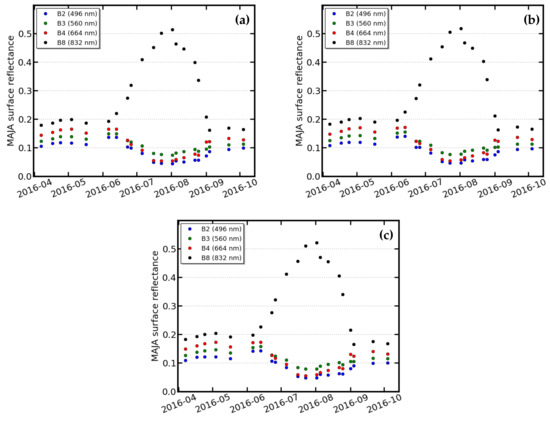 MAJA (MACCS-ATCOR Joint Algorithm) surface reflectance time series over a summer crop pixel from the Carpentras site: (a) with a constant aerosol type; (b) with four CAMS (Copernicus Atmosphere Monitoring Service) aerosol types; and (c) with five CAMS aerosol types.