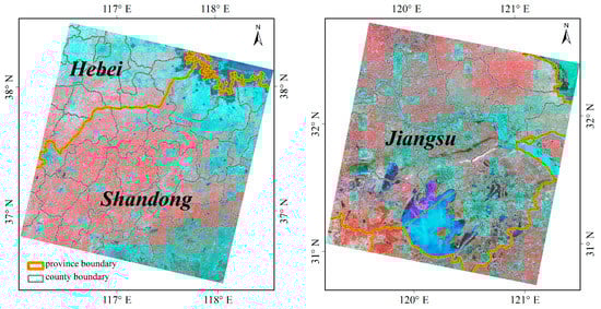 The used datasets include 30 m Landsat 8 Operational Land Imager (OLI) images, 500 m MODIS surface reflectance products, 1000 m MODIS land surface temperature products, and 30 m land cover maps. Landsat 8 surface reflectance higher-level data products in 2015 were obtained from the Earth Resources Observation and Science (EROS) Center Science Processing Architecture (ESPA) website []. The Landsat 8 surface reflectance images delivered along with cloud mask data were generated from the Landsat Surface Reflectance Code (LaSRC). MODIS 8-day surface reflectance Version 6 products from both Terra and Aqua (MOD09A1 and MYD09A1) and MODIS 8-day land surface temperature Version 6 products (MOD11A2) in 2014–2016 were downloaded from the Land Processes Distributed Active Archive Center (LPDAAC) website []. The MODIS surface reflectance products along with ancillary quality control data that are indicative to the observation quality were delivered in the Sinusoidal projection at 500 m resolution. The MODIS land surface temperature products were provided in the Sinusoidal projection at 1000 m resolution. To match the spatial extents of the Landsat images, all MODIS products were resampled to 30 m resolution in the Universal Transverse Mercator (UTM) projection. The 30 m resolution land cover data of GlobeLand30 for the year of 2010 were obtained from the website of National Geomatics Center of China []. The classification system of GlobeLand30 includes 10 land cover types: cultivated land, forest, grassland, shrub land, wetland, water bodies, tundra, artificial surfaces, bare land, and permanent snow and ice []. The GlobeLand30 images are also reprojected using the Geospatial Data Abstraction Library (GDAL) tool to match the spatial extents of Landsat images. Multi-temporal very high-resolution images of GaoFen-1 (GF1, 2 m spatial resolution) and GaoFen-2 (GF2, 1 m spatial resolution) that were acquired during key phenophases of crop growth were sourced from China Center for Resources Satellite Data and Applications []. For the SD scene, the used images include GF-1 images acquired on 6 January, 29 March, 26 July and 20 October 2015 and GF-2 images acquired on 23 March, 26 April and 26 September 2105. For the JS scene, the used images include GF-1 images acquired on 24 March, 14 June, 29 July and 3 December 2015. All sourced GF images are almost cloud-free and have already been preprocessed with radiometric correction, geometric correction, and band fusion.