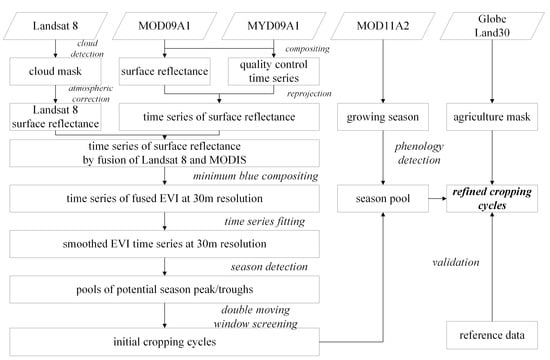 As improved based on our previous study [], the method to map cropping cycles (Figure 2) involves three main steps as follows: (1) generating 8-day time series surface reflectance data at 30 m resolution based on fusion of Landsat and MODIS data; (2) deriving and smoothing fused EVI time series at 30 m resolution; and (3) extracting cropping cycles based on the smoothed fusion time series and refining mapped cropping cycles based on land surface temperature data and land cover maps.