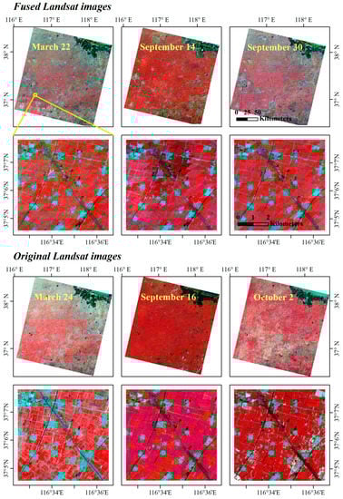 STARFM is a robust tool in generating high-resolution surface reflectance data using Landsat and MODIS images, and has found to achieve good performance over forest and crop areas. Here, we apply the STARFM algorithm to blend Landsat OLI surface reflectance images and MODIS 8-day surface reflectance data, which have already been preprocessed to account for atmospheric correction and screen out cloud contaminated pixels. For each scene, one clear and good quality image of Landsat OLI at the key phase of crop growth was selected as the fine-resolution image for fusion (i.e., the Landsat 8 image acquired on 25 April 2015 for the SD scene and the Landsat 8 image acquired on 13 October 2015 for the JS scene, respectively). The 8-day MODIS products that have the closest observation dates with the Landsat images were chosen as the matched coarse-resolution image, supposing that the differences of the acquisition time between Landsat and MODIS input data are negligible. The entire time series of MODIS surface reflectance data from 2014 to 2016 were then used to generate the 30 m 8-day surface reflectance data separately for both the Terra and Aqua products. To deriving EVI time series data, the near-infrared, red, and blue bands (Landsat OLI band 5, 4, and 2, and MODIS band 2, 1, and 3, respectively) were processed with false-color-composite images shown in Figure 3 as examples. Based on visual examination, STARFM could evidently generate reasonable images at both high spatial and temporal resolutions by dealing with the effects of land cover mixtures at MODIS resolutions.
