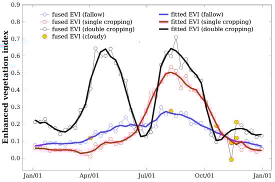 There is a need to process the fused EVI time series with appropriate smoothing methods because the fused EVI time series as generated from the MODIS 8-day composite data could contain a certain degree of noise originated from sources such as atmospheric contamination and viewing and illumination angles. The software of TIMESAT is used to produce smoothed EVI time series for the identification of cropping cycles. TIMESAT provides three fitting algorithms, including asymmetric Gaussian, double logistic, and adaptive Savitzky–Golay. Based on the findings of previous studies [], we applied the filter of adaptive Savitzky–Golay to the fused EVI time series. To preserve the subtle information of crop phenology variation, we applied the second-order polynomial and the window size of 4 for the 8-day composite data (i.e., 32-days).