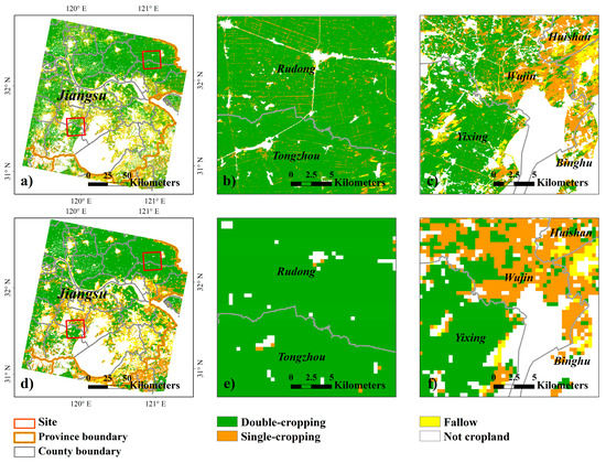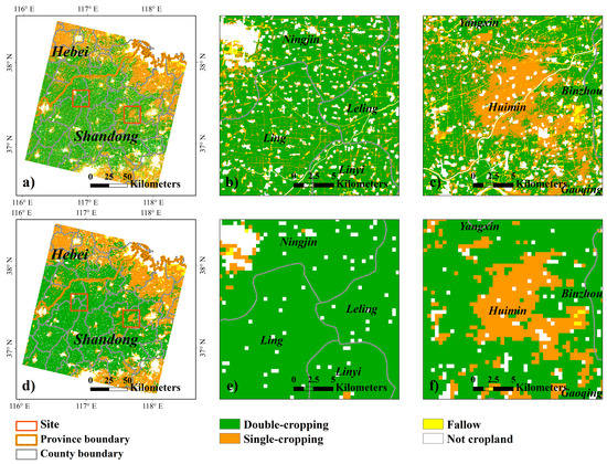 The mapped cropping cycles in 2015 for the two study scenes in both SD and JS are shown in Figure 6 and Figure 7, respectively. The spatial distribution of the cropping cycles is consistent with our general knowledge of cropping activities. For the SD scene, cropping intensities vary from double cropping to single cropping as the latitude increases, mostly because the climate and environment resource gradually become unsuitable for double cropping in northern Shandong Province in the North China Plain. For the JS scene, cropping intensities change from double cropping to single cropping as latitude decreases. The areas in southern Jiangsu Province in the Yangtze Downstream Plain experience fast economic development and urbanization, resulting in fragmental agricultural fields. Although the climate allows for planting multiple crops in a year, some farmers lived near the city area choose to plant crops only once a year or even leave the cropland uncultivated, because cultivating the croplands often costs higher capital and labor inputs but generates less net profits than working in the industry.