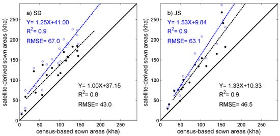 Gross sown areas for the year of 2015 are compared between national census data at the county level and maps of cropping cycles as derived from: (a) SD; and (b) JS. The black dots represent estimates derived from 30 m fusion data and the blue hollow dots represent estimates derived from the 500 m MODIS data.