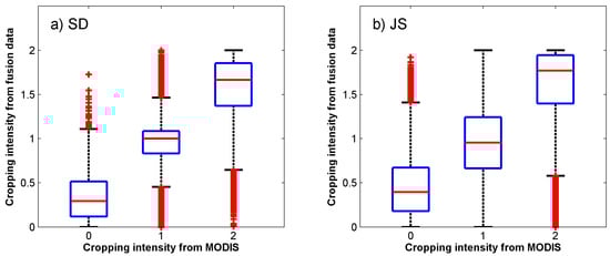The boxplots for the distribution of crop intensities are shown for the scenes of: (a) SD; and (b) JS. The 30 m cropping cycles mapped using the fusion data are aggregated to 500 m as fractional maps and are then compared with the binary cropping cycles mapped using the 500 m MODIS data for the entire scene.