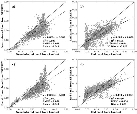 Scatter plots of real surface reflectance and predicted surface reflectance in near-infrared and red bands using STARFM (a,b) and ESTARFM (c,d). The solid lines denote the 1:1 lines and the dash lines denote the regression lines.