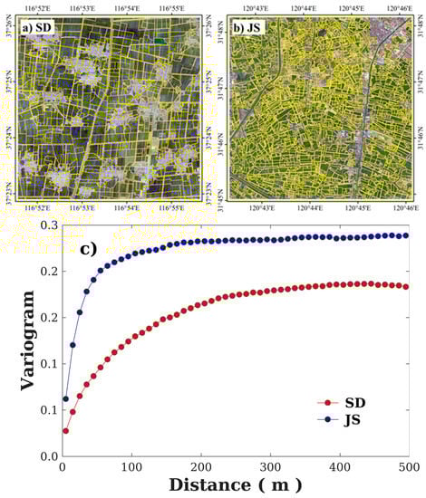 The hand-digitized polygons on the backdrops of GF1 images in both: (a) SD; and (b) JS; and (c) the corresponding variogram.