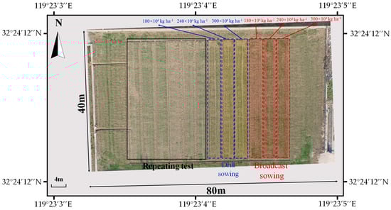 The standard of evaluating uniformity was formulated by exploring the change of yield under different uniformity conditions. The field was divided into 2.5 m × 2.5 m regions. The grain yield and uniformity of each region was measured correspondingly. The grains were dried and weighed after manual harvesting, and then the grain yield of each region was obtained. The manual measurement steps of seed emergence uniformity are: (1) selecting 50 points randomly in each treatment; (2) marking each point by a 30 cm × 30 cm square and counting the seedling number manually; and (3) calculating the uniformity by Equations (2)–(4). The reference number of missing seedling region was counted manually. The length of missing seedling region for drill sowing field were measured by “Ruler” tool in the Agisoft Photoscan software. The area of missing seeding for broadcast sowing field were measured by “Polygon” tool in the Agisoft. The miss seedling rates of broadcast and drill sowing are calculated by Equation (7).