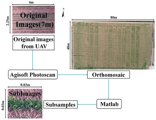 A DJI 1 Inspire RAW UAV was selected to obtain images. The camera calibration function of DJI Go APP (http://www.dji.com/) was used for camera calibration. It was equipped with a RGB camera with 16 megapixels, which is capable of acquiring images vertically with a flight height of 7 m (the spatial resolution is about 0.6 mm). The coordinates of the subsample over each microplot were manually defined using the orthomosaic image generated by the Agisoft Photoscan software (Version 1.2.2, Agisoft LLC., St. Petersburg, Russia). Matlab (V2016a, MathWorks, Natick, MA, USA) was used to process the images. The flowchart of UAV image preprocessing is shown in Figure 2. In this study, UVA data wree acquired on 17 February 2015 and 26 February 2016. All UVA data were acquired during 3:00 p.m.–5:00 p.m.