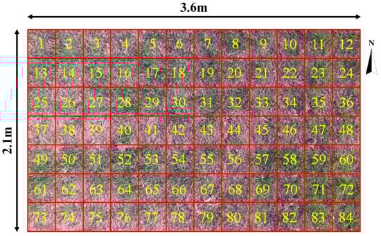 Based on the row spacing of drill sowing, the entire image in each date was divided into 30 cm × 30 cm sub-regions (Figure 3), and then the percentage of wheat cover in each sub-region was calculated. Each replicate was divided in to 990 sub-regions. Coverage refers to the percentage of wheat seedling pixels in each sub-region. The image segmentation methods for drill and broadcast sowing were the same. The vegetation index (Equation (1)) and Otsu’s algorithm were used to extract wheat seedlings in the image [17]. The reference threshold value obtained by Otsu’s algorithm was about 40 in both dates. The rows of drill sowing should be detected before getting the missing seedling region. The missing seedling region of broadcast sowing could be obtained without detecting rows. Thus, different analytical methods were designed in this study.