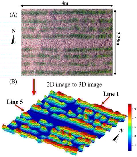 Figure 4 shows the three-dimensional effect of drill sowing on wheat coverage. In the three-dimensional diagram, wheat was clearly divided into different “hills.” The ridges can be easily positioned based on Equations (5) and (6).