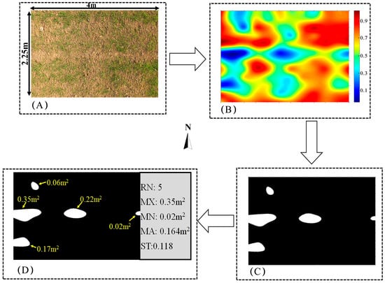 Extraction of regions with missing seedlings for broadcast sowing of wheat: (A) Original image of broadcast; (B) Color map of coverage distribution; (C) Missing seedling region; (D) Information extraction of missing seedling region.