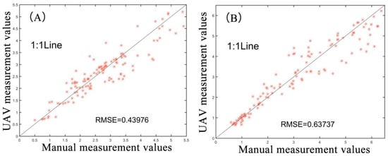 The summary of the measured uniformity by UAV is shown in Table 2. The test results of UAV image-based uniformity delineation of wheat seed emergence is shown in Figure 7. From the 1:1 line, it can be seen that the uniformity measurement value of different sowing methods only slightly varied when compared with the manual measurement value. The R2 values of drill and broadcast sown wheat were 0.83** and 0.89**, respectively. The RMSE values were 0.44 and 0.64, respectively. The maximum deviation of broadcast and drill sown wheat were 1.22 and 2.24, respectively.