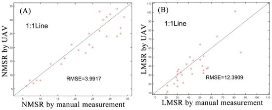 Test results of the: number (A); and area (B) of regions with missing seedlings for broadcast sowing Note: NMSR and LMSR refer to the number and area of regions with missing seedlings, respectively.