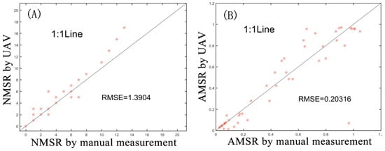 The summary of the measured information of missing seedlings is shown in Table 4. The 1:1 line between the UAV measurement results and manual measurement results of the number and area of broadcast sowing region of missing wheat seedlings is shown in Figure 9. The R2 value of the number of region of missing seedlings was 0.93**, and RMSE was 1.39; the R2 value of the area of region of missing seedlings was 0.78**, and RMSE was 0.20. The average number of these regions obtained from UAV images and manual measurement was 4.5 and 5.2, respectively. The average area of these regions obtained from UAV and manual measurement was 0.57 cm2 and 0.51 cm2, respectively, which shows little difference.
