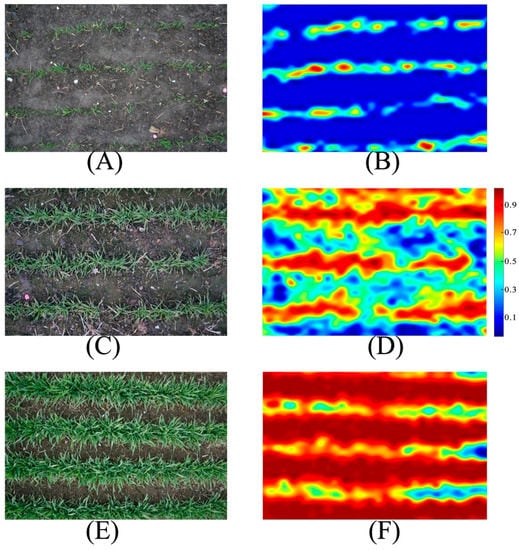 Extraction effect of wheat images and coverage at different stages of growth: (A) original image of three leaf stage; (B) coverage map of three leaf stage; (C) original image of five leaf stage; (D) coverage map of five leaf stage; (E) original image of jointing stage; and (F) coverage map of jointing stage.