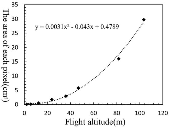 A reasonable range of UAV flight height falls between 5 m and 15 m when acquiring images. In the present study, the relationship between UAV image acquisition altitude and actual area of each pixel was demonstrated through standard editing methods (Figure 11). A low flight height makes it difficult to acquire stable images because the wheat seedlings may sway in the wind, resulting in increased labor to deal with image processing. At the other extreme, a high flight height will lead to the collection of obscure images.