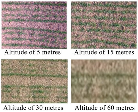 When the UAV flies at an altitude of 5 m, the image is relatively clear and some of the details of the wheat are visible. At 15 m, sporadic regions are fuzzy, but this has smaller impact on the height extraction (Figure 12). When the flight height reaches 30 m, the image becomes blurred, and the uniformity extraction error is relatively large. Meanwhile, at 60 m, poor image quality makes it impossible to carry out uniformity evaluation.