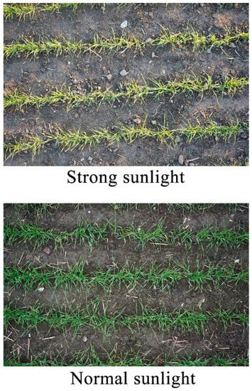 Weather only slightly affects UAV image acquisition. After collecting the field data, images acquired in the morning or evening with relatively soft light or cloudy weather were available for review. However, particularly strong illumination is unsuitable for data collection because strong light may cause the wheat seedlings to appear white (Figure 13), making it impossible to completely extract the plants using Equation (1).