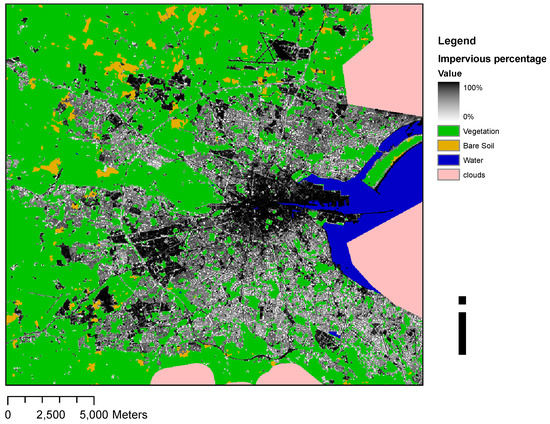 Land-use/land-cover map indicating the percentage of impervious surface within the urban mask in gray shades ([26,30] (with permission from Elsevier)).