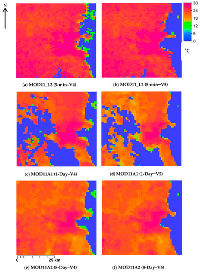 MODIS/Terra land surface temperature (in °C) products used in this study including, (a,b) 5 min product; (c,d) 1 day product; and (e,f) 8 days product; with two different collection methods (V4 and V5), at 960 m resolution.