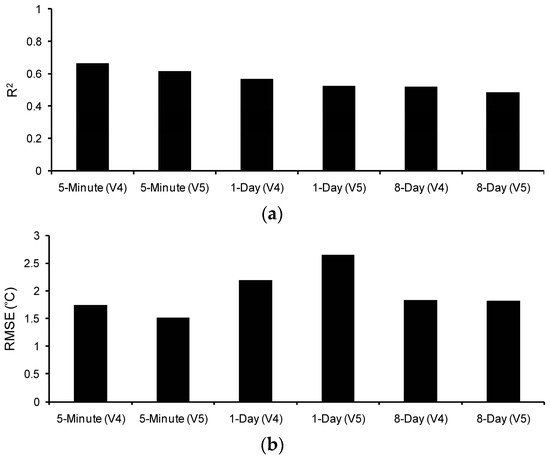 In this study, the calculated systematic bias shows that MODIS/Terra 5-min, 1-Day, and 8-Day land surface temperatures (Figure 2) are, respectively, 5.23 °C, 9.85 °C, and 8.15 °C (Table 2) lower than the Landsat 7 ETM+ land surface temperature mean value. Figure 3 shows the results of the correlation between MODIS/Terra land surface temperatures products against the observed aggregated Landsat 7 ETM+ image. The MODIS/Terra 5-min land surface temperature products show a higher correlation (R2) (Figure 3a) and lower RMS error than the other products (Figure 3b). MODIS/Terra 1-Day and 8-Day land surface temperature products show, as expected, a lower correlation than the 5-min products, but the differences are relatively small. The RMSE for the 1-Day product is higher than for the 8-Day product (Figure 3b). The reason is the fact that the 8-Day product averages images over a longer period. The 1-Day product covers a much shorter period. It is therefore likely that this product has a larger RMS error because of a higher probability of different meteorological conditions than during the Landsat 7 ETM+ acquisition. Hence, the MODIS/Terra versus Landsat 7 ETM+ correlations have smaller RMSE values for the 5-min products than the 1-Day products.