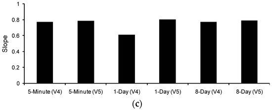 The slope (Figure 3c) shows the gradient of MODIS temperature values with the Landsat 7 ETM+ image. If the slope equals 1, MODIS and Landsat 7 ETM+ land surface temperature values are equal, hence have the same gradient. All product types of MODIS/Terra land surface temperatures have a similar slope of approximately 0.8. Only the 1-Day (V4) product shows a lower slope than the average (~0.6), and this is possibly a result of the fact that the meteorological conditions during acquisition of the images used in aggregating the 1-Day product were more variable.