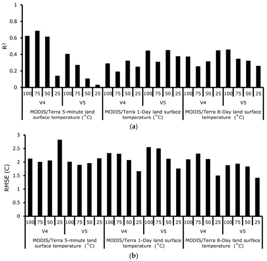 The highest correlation between impervious percentage and the MODIS/Terra 8-Day land surface temperature product was obtained when 25% and 100% of impervious percentage data was used in the regression analysis with V4 and V5. These scenarios result in a R2 of 0.38 and 0.37 for V4 and R2 of 0.26 and 0.46 for V5 (Figure 4a), and an RMSE error of 1.50 °C and 2.09 °C for V4 and 1.41 °C and 1.88 °C for V5 (Figure 4b).
