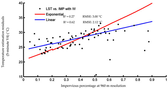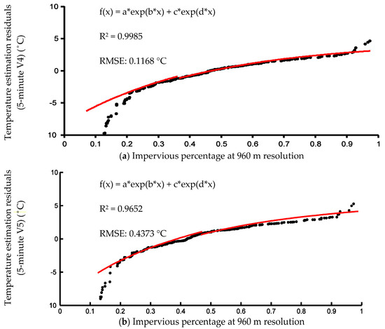 The impervious percentage was found to be highly correlated with temperature estimation residuals using the exponential regression fit (R2 = 0.9985 and 0.9949 with a small root mean square error (RMSE) of 0.12 and 0.44 for the MODIS/Terra 5-min land surface temperature products of the V4 and V5 collections, respectively).