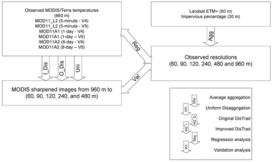 The different steps to downscale MODIS/Terra land surface temperature products from 960 to 60 m resolution using the original DisTrad method are as follows: